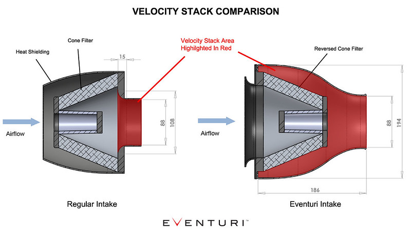 Das Filtergehäuse besteht aus einem Hochleistungsfilter, einer Aluminiumhaube, einer lasergeschnittenen Halterung, einer Carbon-Wärmeabschirmung und dem Carbon-Pod selbst, der so verlängert ist, dass er den MAF-Sensor und die Turbine umfasst. Der Carbon-Pod umhüllt den umgekehrt montierten Filter und leitet den Luftstrom sanft zum integrierten MAF-Ansaugrohr. Diese sanfte Verringerung der Querschnittsfläche ruft den Venturi-Effekt hervor, bei dem der Luftstrom beschleunigt wird, während die laminaren Bedingungen erhalten bleiben. Man kann sich das wie einen großen Ansaugtrichter vorstellen – unten finden Sie ein Diagramm, das den Vergleich zwischen unserem zum Patent angemeldeten Design und einem herkömmlichen Ansaugsystem zeigt.